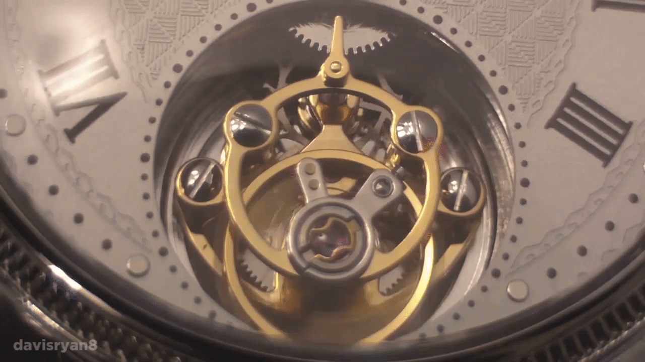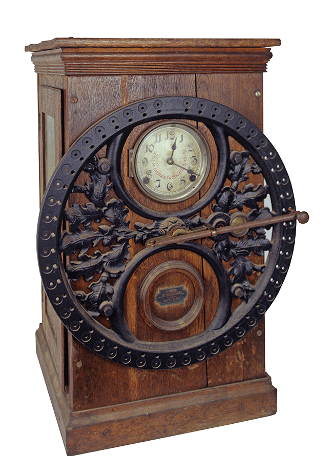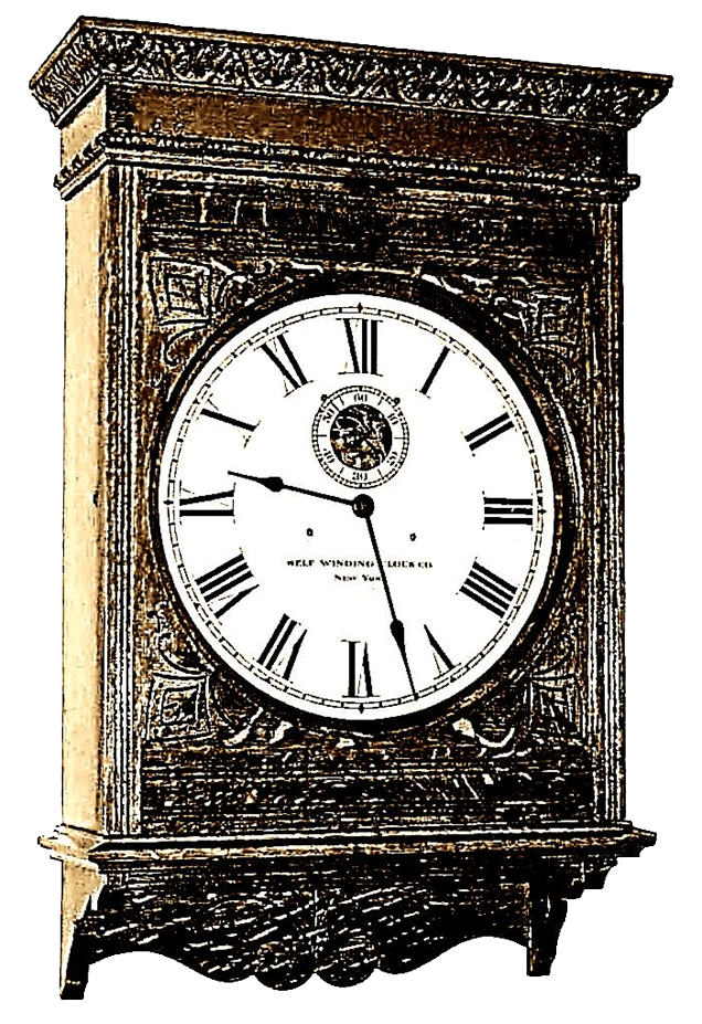 De ‘zelfopwindende’ klok (in conventionele houten kast uit 1908) is een product van de Amerikaanse Self Winding Clock Company (1886-1970). Elk uur werd de veer automatisch opgewonden door een elektromotor die gevoed werd door een batterij met een levens-duur van een jaar. Het bedrijf verkocht ‘exacte tijd’ door haar klokken elk uur telegrafisch te kalibreren via een moederklok die was verbonden met de US Naval Observatory.